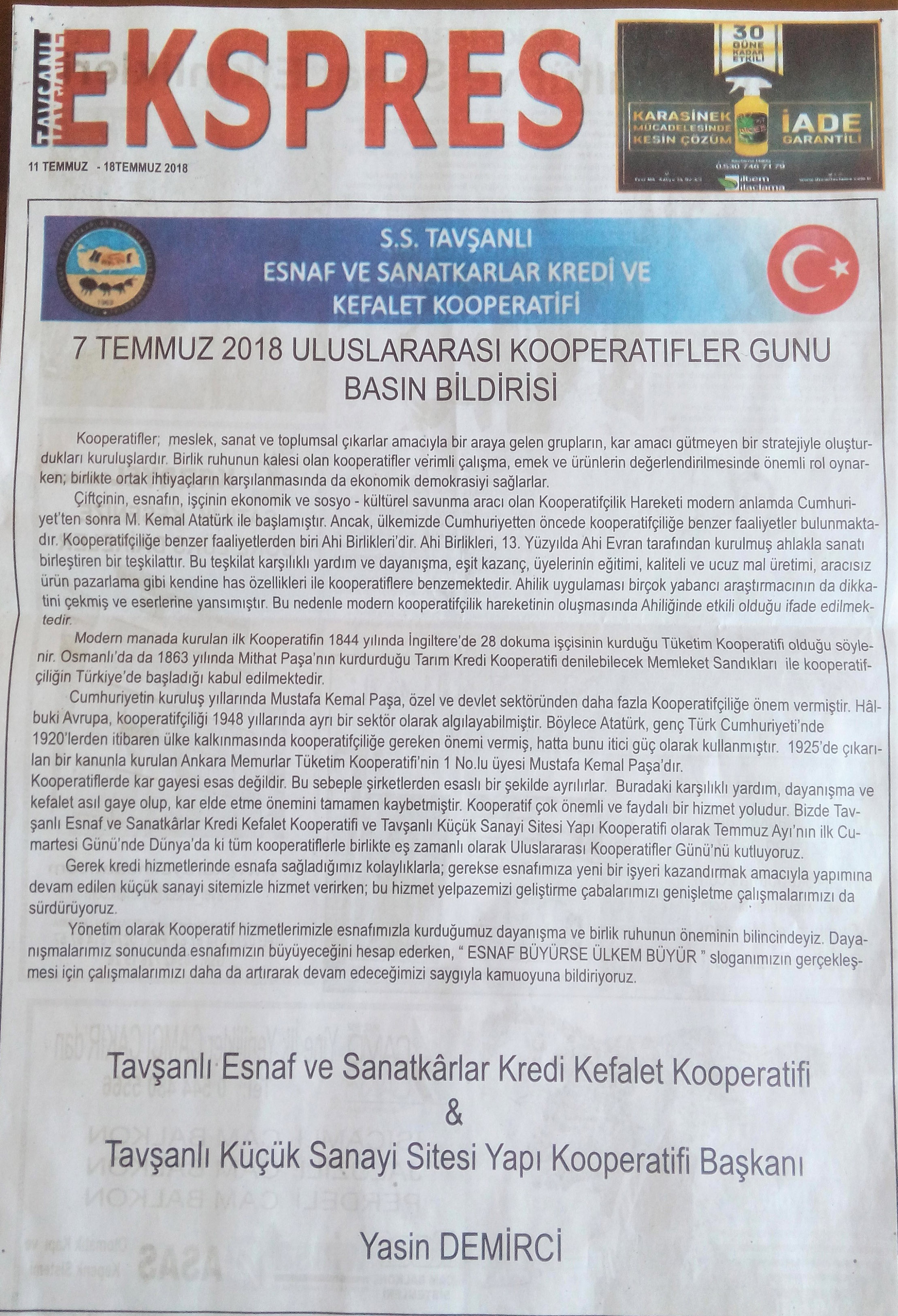 Gazetelerde Yayınlanan 7 Temmuz Uluslararası Kooperatifler Günü İlanlarımız